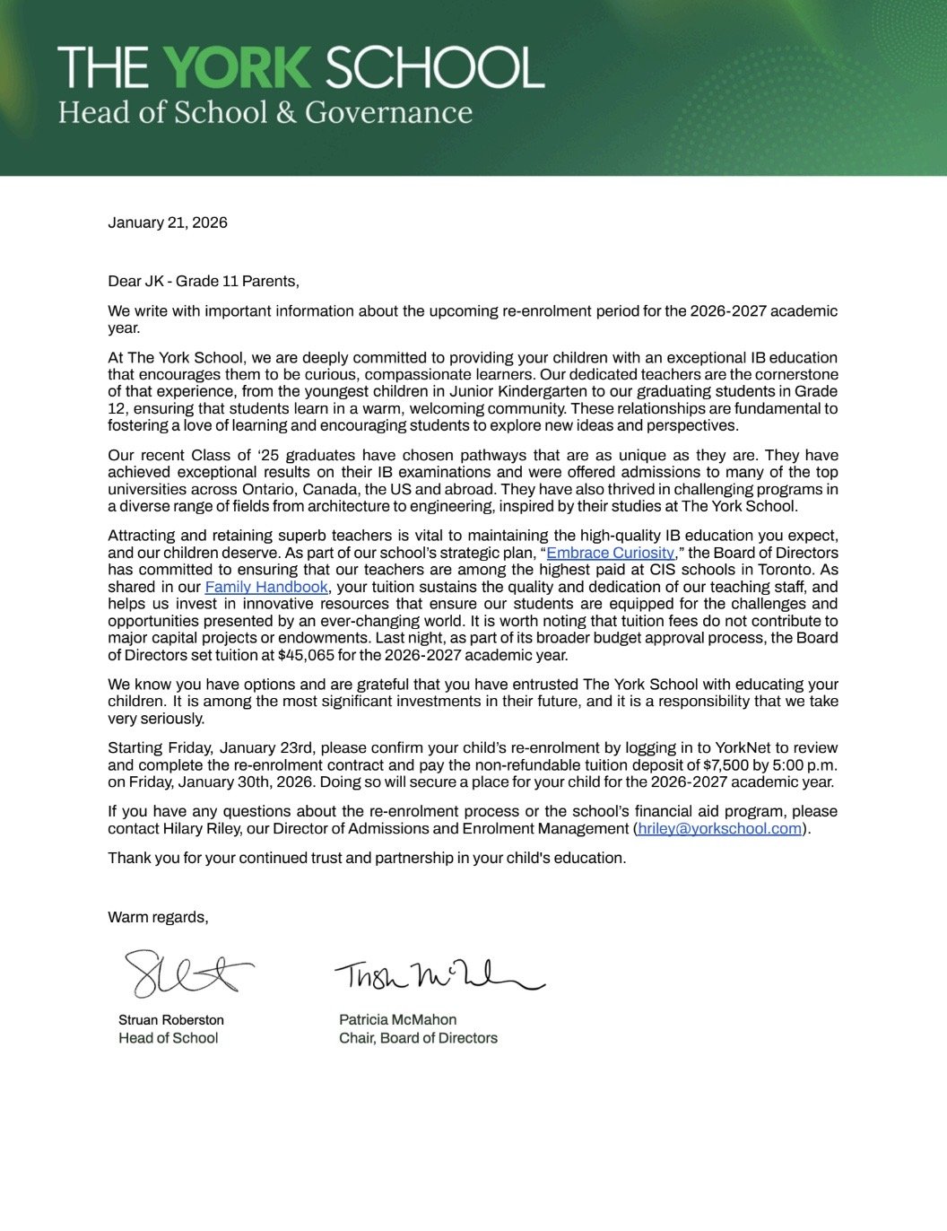 The re-enrolment contract will be available in YorkNet and the deadline to submit it and make your first, non-refundable tuition deposit is 5:00pm on Friday, January 30, 2026. We look forward to continuing to partner with you and your children next year at York.