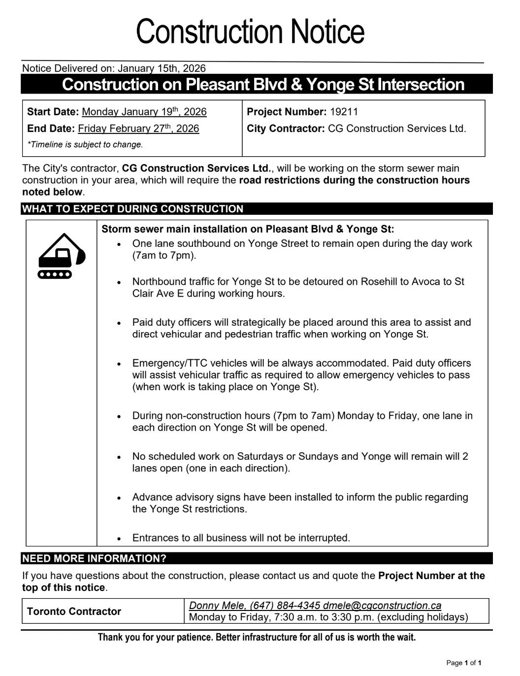 Please see the Construction Notice below that we were made aware of this week. This includes information about lane reductions on Yonge Street during drop off and pick up. You may want to give yourself extra time if you are driving, as this project will be ongoing until the end of February.