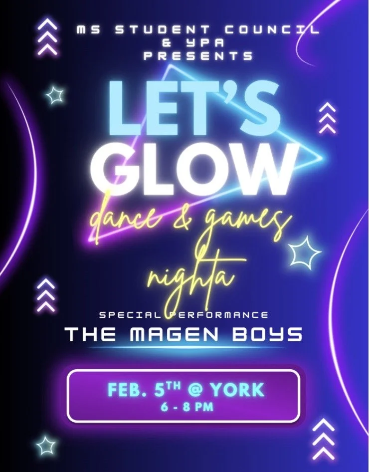 Our Student Life & Belonging team, YPA and Middle School Student Leaders are excited for our upcoming Middle School Dance and Games Night! The theme is Let's Glow (think NEON!).