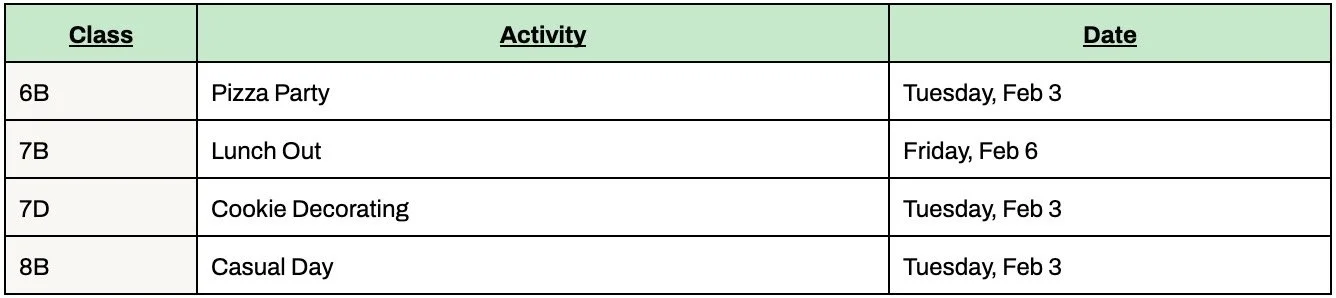 There is no late start on Wednesday, February 11. On February 11, students will follow a compressed schedule and be dismissed by 11:40am. There is no supervision or classes for students in the afternoon of February 11 and all day on February 12. There will also be no lunch service (only grab and go items will be available), athletic practices, or co-curricular activities.
