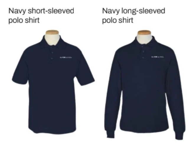 Students should wear one of the following uniform items: the short-sleeved blue polo shirt or the long-sleeved blue polo shirt with their regular uniform bottom.